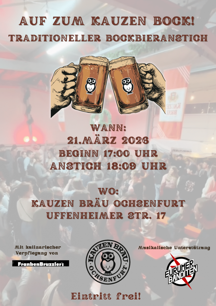 Die Kauzen Bräu lädt daher am Samstag, 21. März 2026 ab 17:00 Uhr, wieder zu ihrem traditionellen Bockbierfest auf das Brauereigelände in Ochsenfurt ein. Der Anstich erfolgt – ganz nach bewährter Tradition – um 18.09 Uhr.